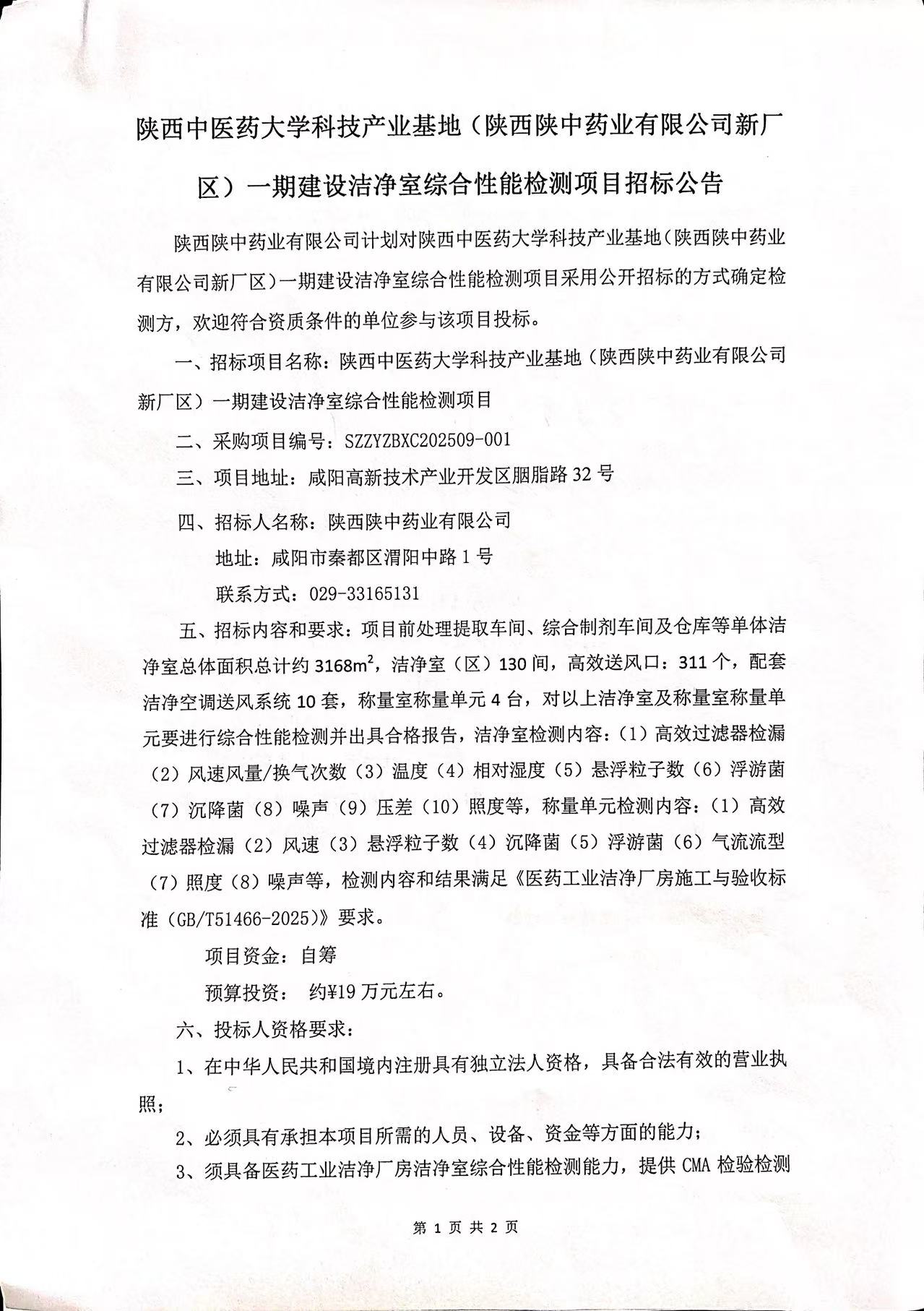 陕西中医药大学科技产业基地(陕西陕中药业有限公司新厂区)一期建设洁净室综合性能检测项目招标公告