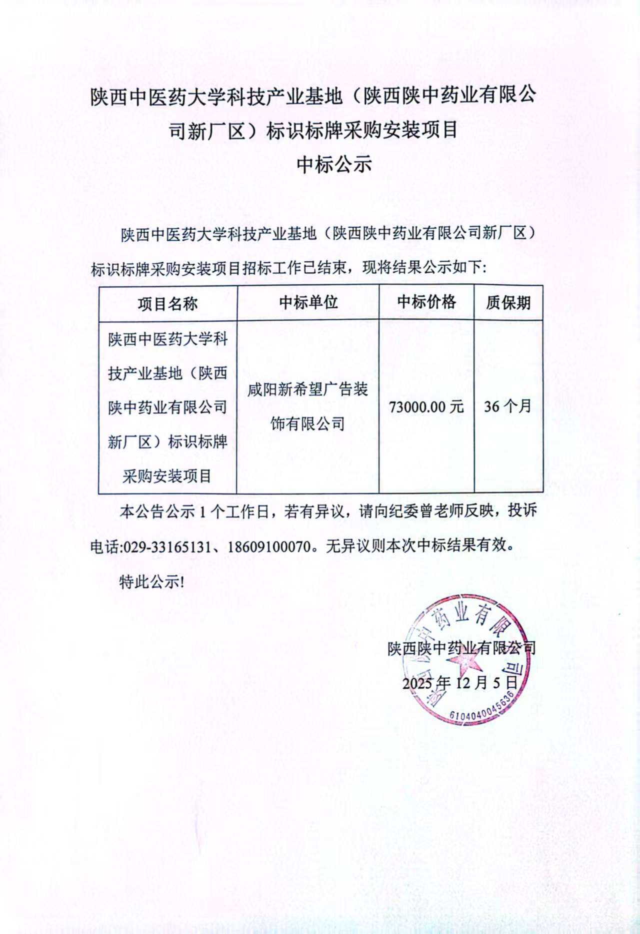 陕西中医药大学科技产业基地(陕西陕中药业有限公司新厂区)标识标牌采购安装项目中标公示