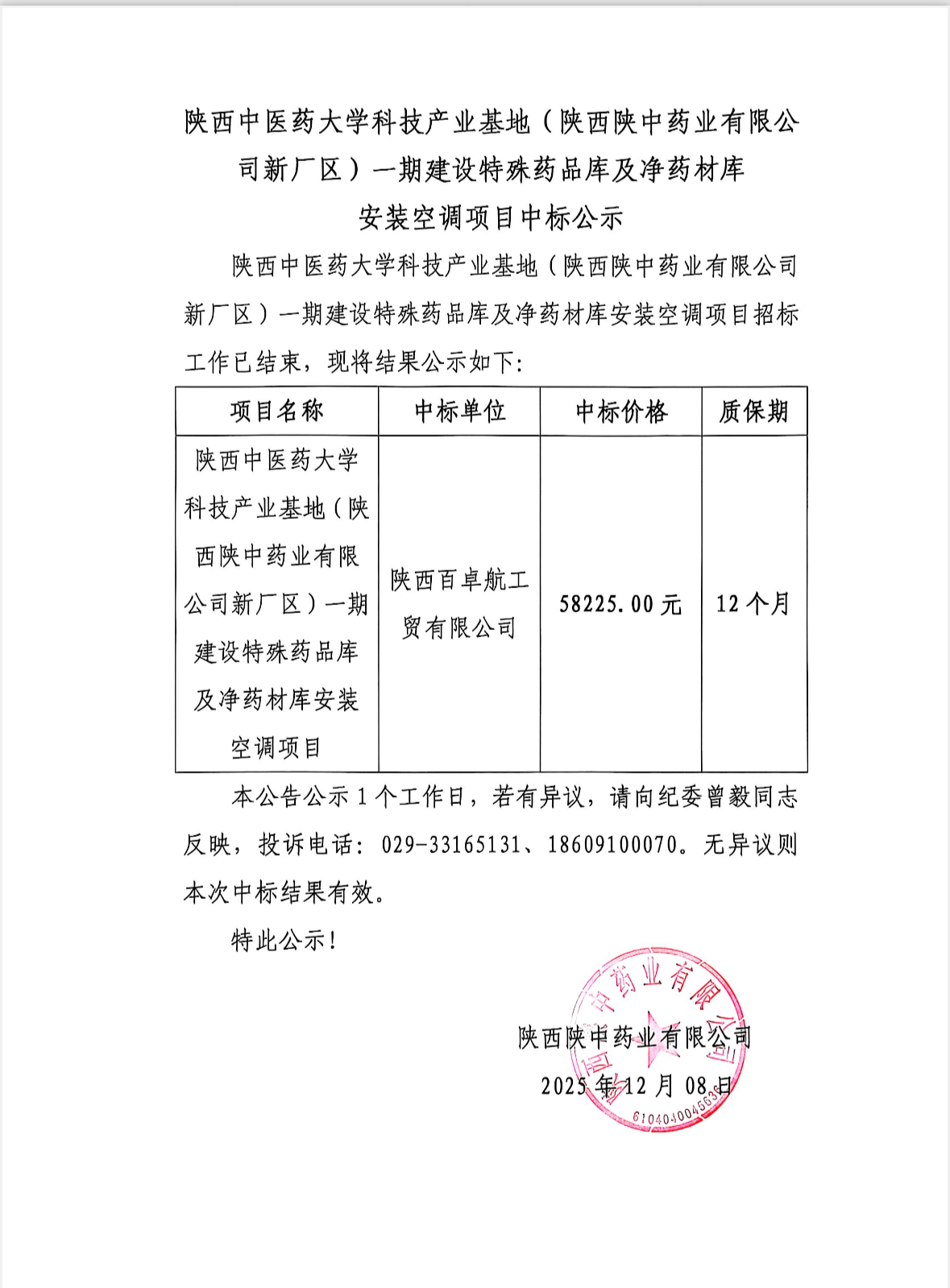 陕西中医药大学科技产业基地(陕西陕中药业有限公司新厂区)一期建设特殊药品库及净药材安装空调项目中标公示