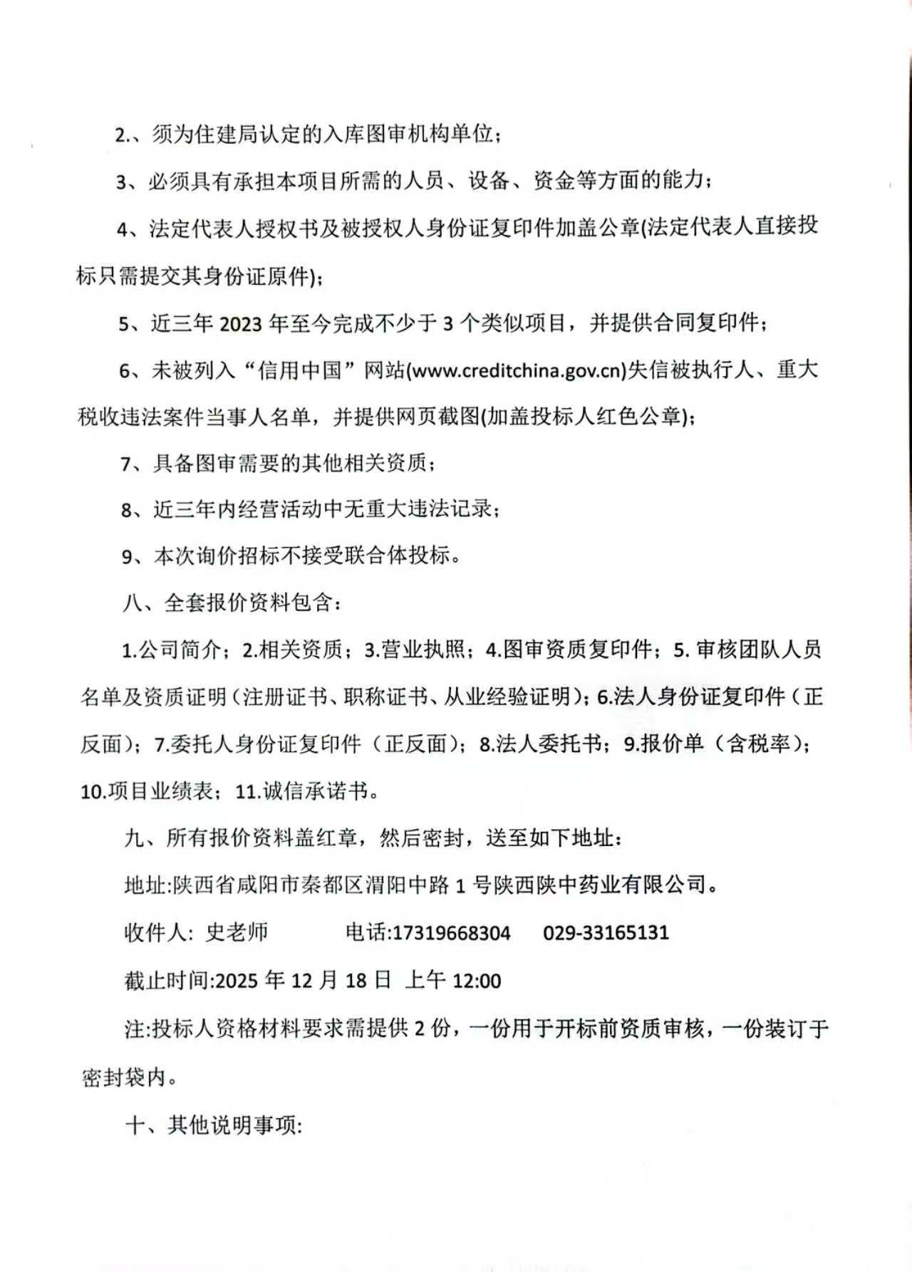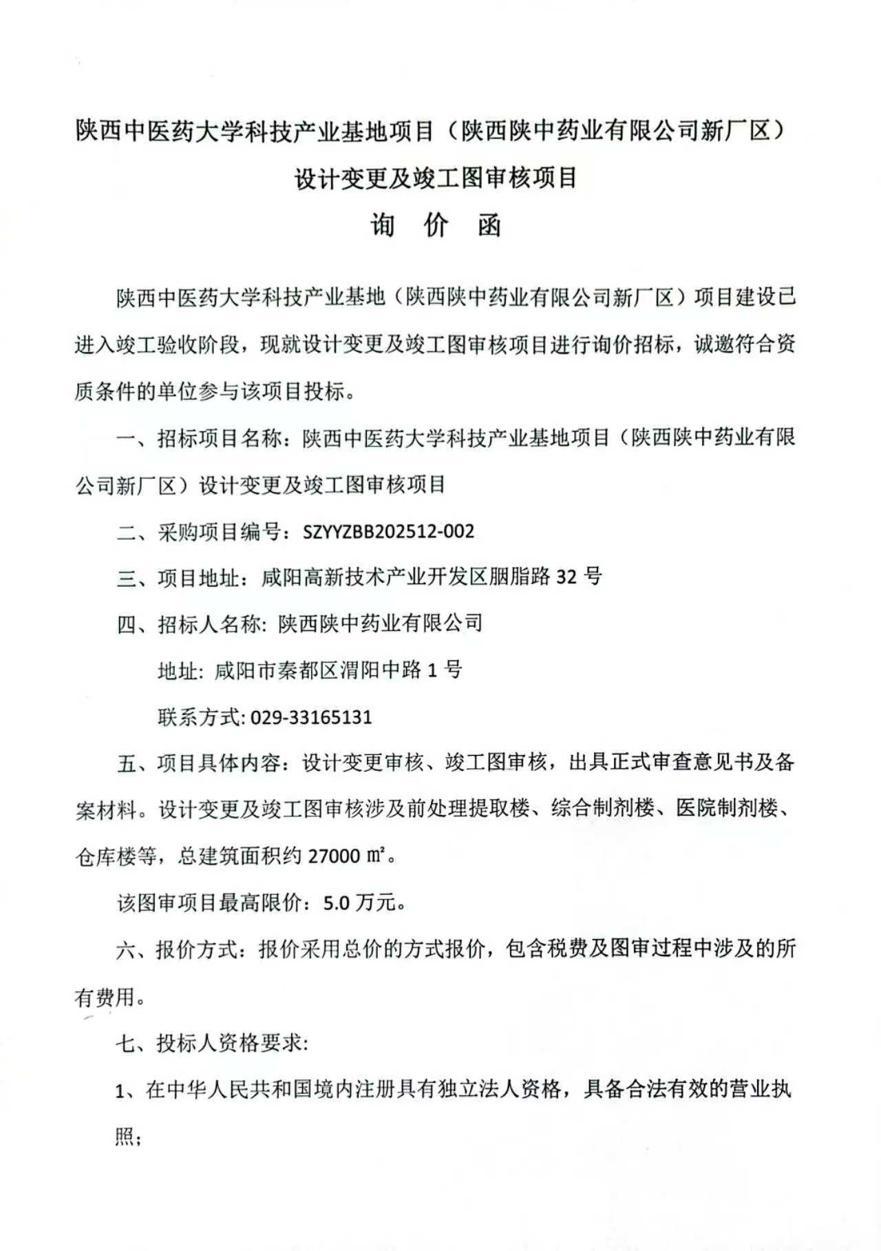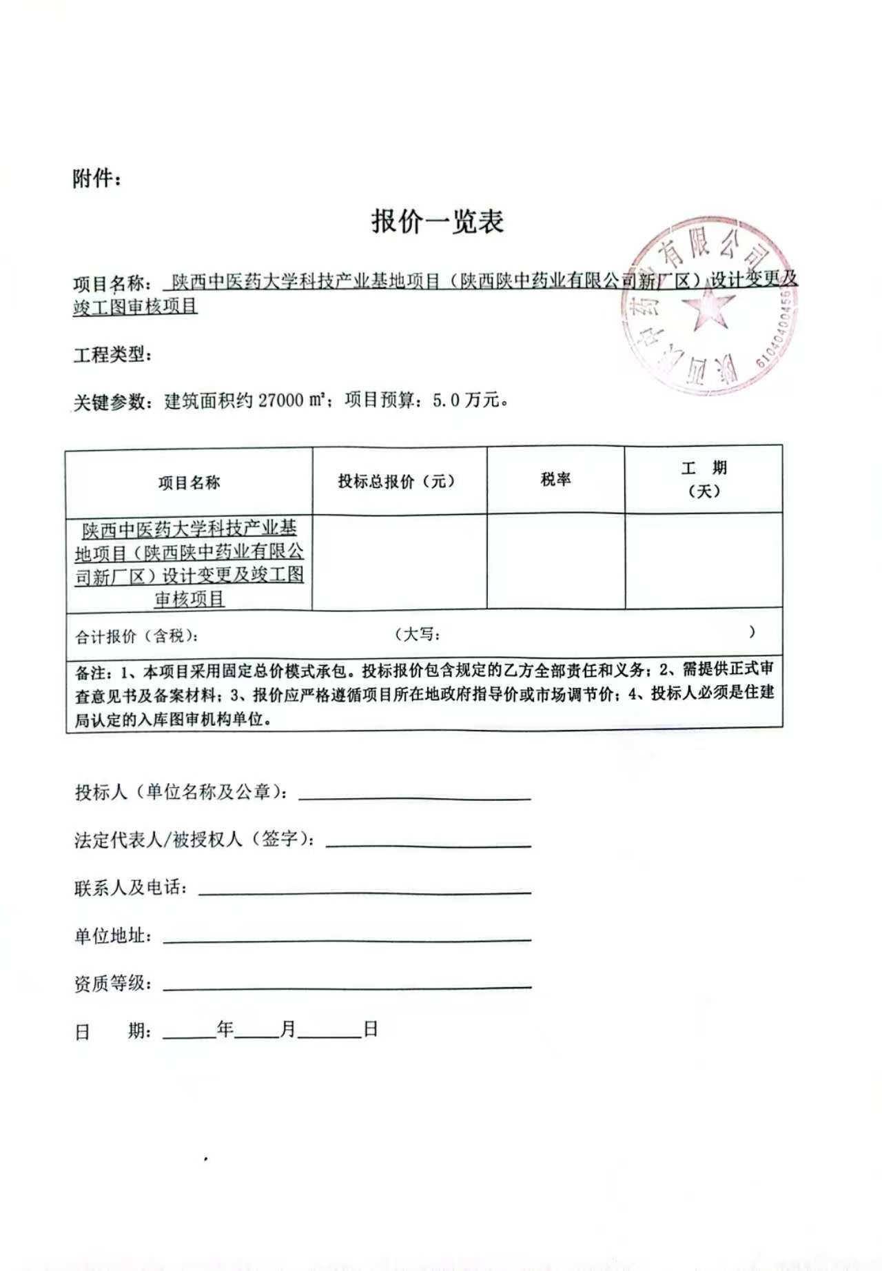 陕西中医药大学科技产业基地项目(陕西陕中药业有限公司新厂区)设计变更及竣工图审核项目询价函