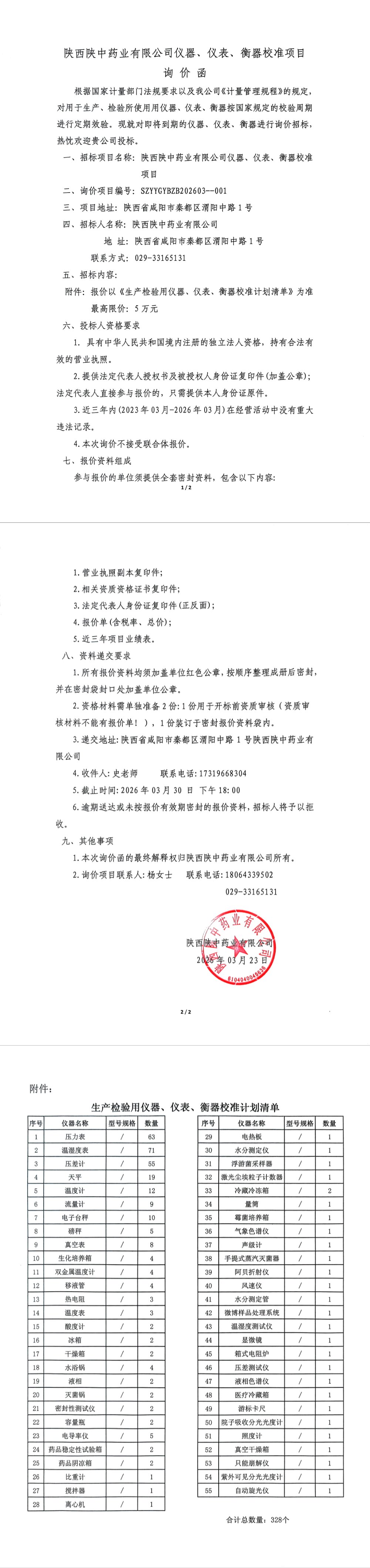 陕西陕中药业有限公司仪器、仪表、衡器校准项目询价函