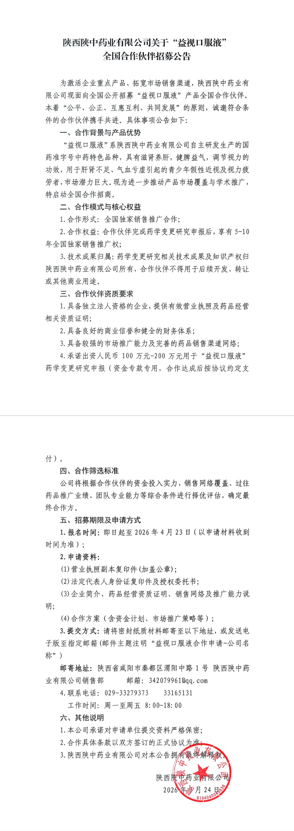 陕西陕中药业有限公司关于“益视口服液” 全国合作伙伴招募公告